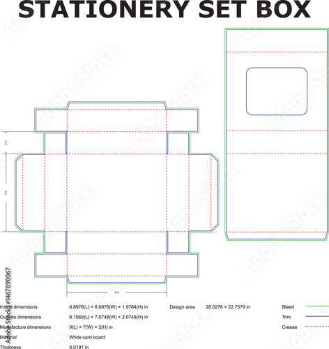 Detailed stationery set box template design with bleed trim and crease guidelines for packaging