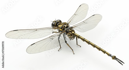 Detailed steampunk dragonfly with intricate mechanical components, showcasing a blend of intricate gears and golden-bronze metallic elements against a bright white background.