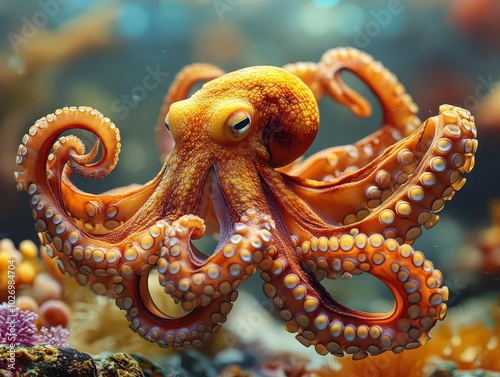 detailed still life of a captivating octopus gracefully swimming in a crystal-clear aquarium, vibrant colors and textures highlighted in high definition, creating an underwater wonderland