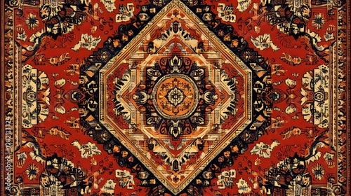 Detailed textile pattern with warm earthy tones, traditional and intricate, rich and vibrant, geometric and symmetrical, cultural and artistic