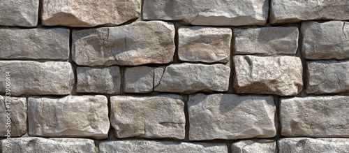 Detailed texture of a stone wall featuring irregularly shaped and sized stones arranged closely together with natural imperfections and graying tones Copy Space