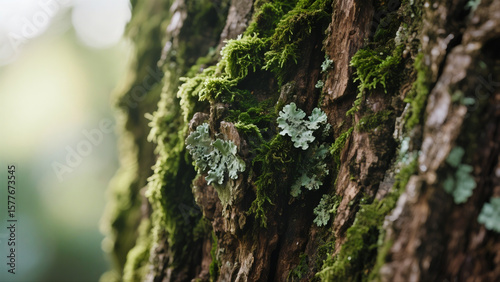 Detailed texture of tree bark covered in moss and lichen, earthy and organic.