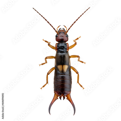 Detailed top-down view of a common earwig insect with prominent pincers and antennae against a clean backdrop