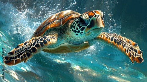 Detailed underwater view of a sea turtle swimming.