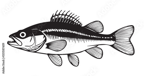 Detailed Vector Illustration of a Bass Fish, Line Art Style with Shaded Details, Black and White, Isolated on White Background, Ideal for Fishing and Aquatic Themes.