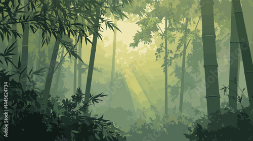 Detailed view of a bamboo forest, capturing the serene and peaceful atmosphere with tall bamboo stalks, green foliage, and soft sunlight filtering through the leaves.