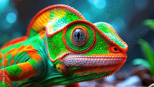 Detailed View of a Chameleon. Stunning Multicolored Chameleon with Bright Skin. The Notion of Disguise and Vivid Hues. Exotic Tropical Pet