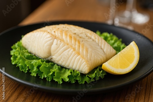 Detailed view of a fresh fish fillet accompanied by lettuce on a seafood dish served in a dark plate