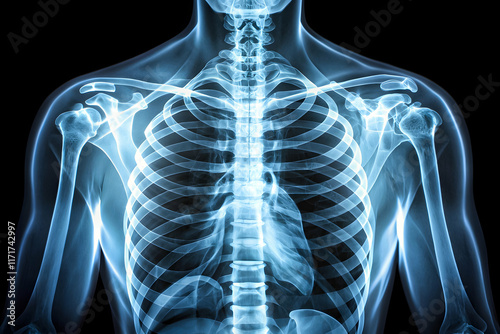 Detailed view of a human chest X-ray highlighting ribs, lungs, and shoulders for medical analysis and education