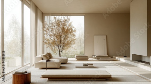 Detailed view of a minimalist living room with a large window, neutral-toned furniture, and sparse decor