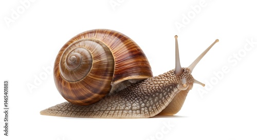 Detailed view of a snail with its shell and antennae, perfectly isolated on white backdrop.