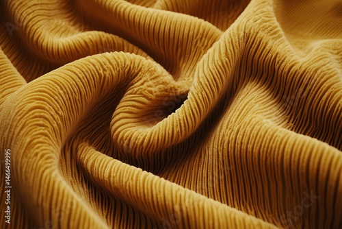Detailed view of amber corduroy cloth, with soft waves forming intricate patterns under the warm light