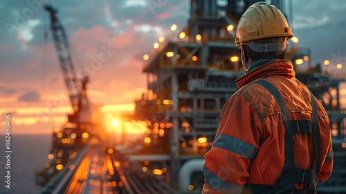 Detailed view of an oil worker inspecting a drilling rig with safety gear, Oil industry workforce, Labor and employment