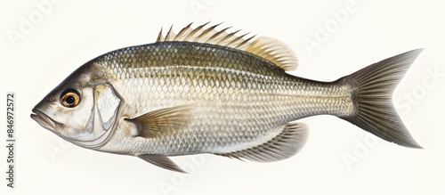 Detailed view of two banded bream Zweibindenbrasse Diplodus vulgaris on a white backdrop. with copy space image. Place for adding text or design