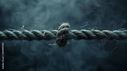 Detailed visual of a breaking rope with frayed ends, emphasizing the moment of tension, captured against a somber backdrop