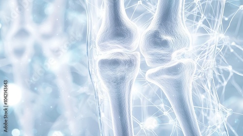 Detailed visualization of human knee joints surrounded by connective tissue and nerves illuminated in a soft, glowing light