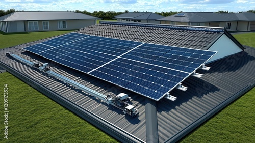Detailed visualization of solar panel integration into a house roof, showing assembly and connection parts, renewable energy concept