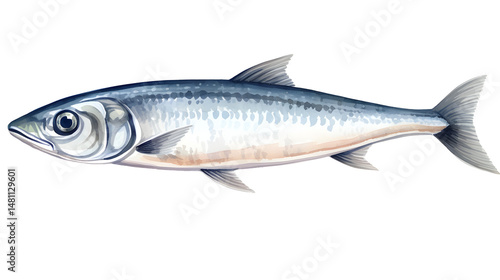 Detailed watercolor illustration of a single sardine fish isolated on white background