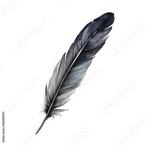 Detailed Watercolor of a Glossy Black Crow Feather on White Background