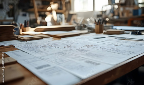 Detailed workspace with blueprints and sketches on a wooden table, showcasing a creative process in a well-lit studio