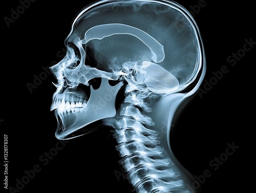 Detailed X-ray Image of Human Skull and Neck Vertebrae, medical pictures radiography
