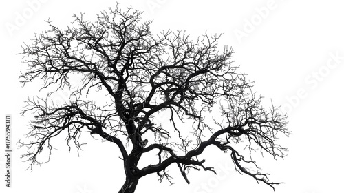 Details dried black leafless tree branches of big tree silhouette on white sky background,isolated.