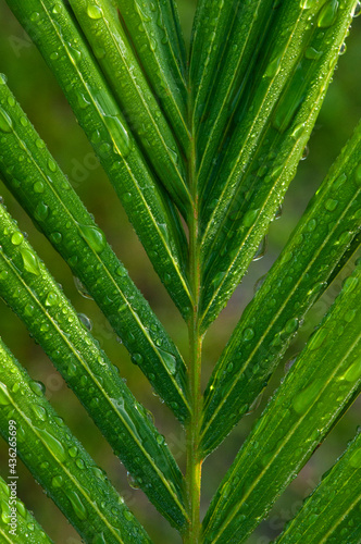 Detalhe de folash de palmeira com orvalho e predominância de verde
