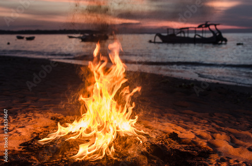 Detalle de una hoguera en la playa durante el atardecer en Bali