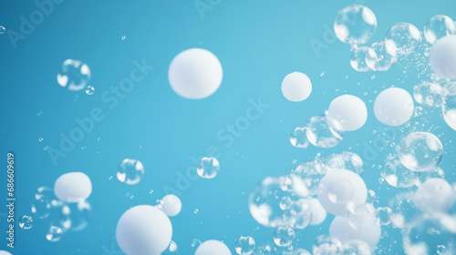 Detergent foam bubble on blue background. Soap, shower gel, shampoo foam texture. Copy space. Generative AI