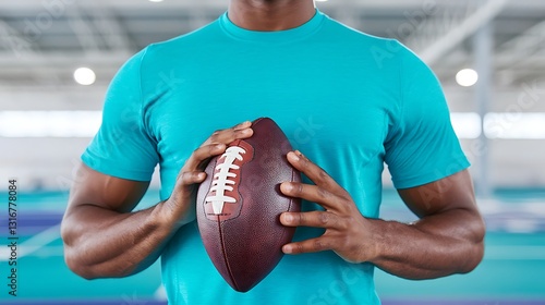 Determined Athlete Holding a Rugby Ball Ready for Action in a Sports Training Facility