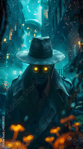 Determined Cartoon Detective Investigates Underwater Mermaid Crime Scene with Glowing Alien Tech