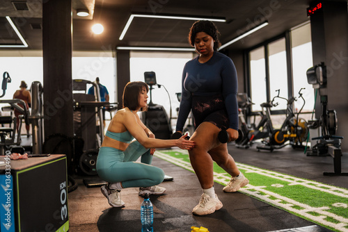 Determined overweight woman performing lunges with dumbbells, guided by her personal trainer, inside a modern gym, showcasing commitment to fitness and a healthy lifestyle