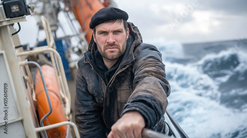 Determined sailor bracing against the stormy sea on a fishing boat adventure
