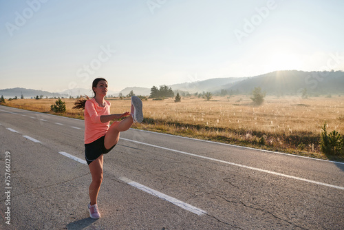 Determined Stretch: Athletic Woman Embraces Post-Run Flexibility in Nature.