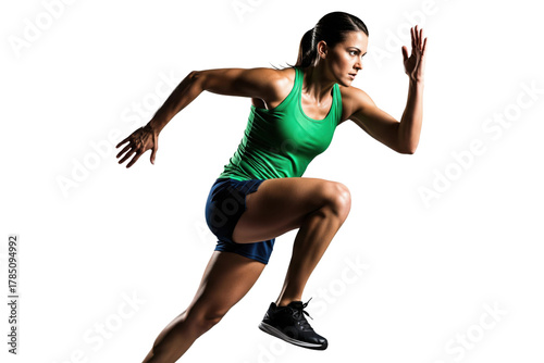 Determined woman in a green tank top running with high knees