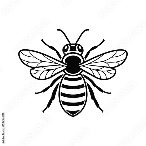 Detled front view of honey bee with wings spread, insect line drawing vector illustration