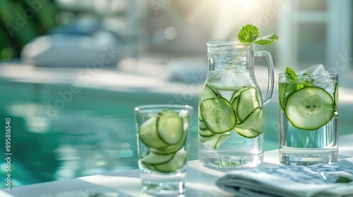 Detox water with cucumber and mint in a transparent decanter, close-up view, space for text