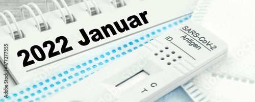 Deutscher Kalender Januar 2022 Corona Pandemie mit Antigen Test SARS-CoV-2 und Masken
