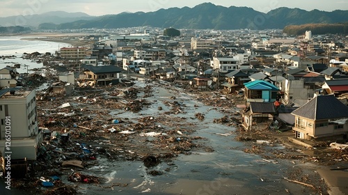 Devastated coastal city after a massive tsunami with widespread destruction, debris, and flooded streets