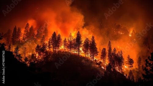 Devastating night forest fire with intense flames and smoke engulfing pine trees on a hillside, showcasing an environmental disaster