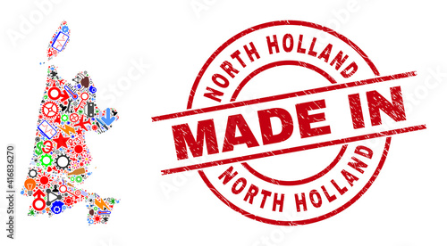 Development mosaic North Holland map and MADE IN grunge rubber stamp. North Holland map composition formed with spanners, cogs, instruments, aviation symbols, cars, electricity bolts, helmets.