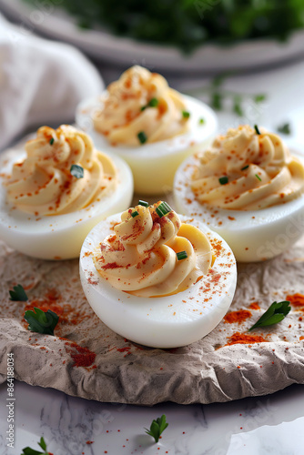 Deviled Eggs: Hard-boiled eggs halved, with the yolks mixed with mayonnaise and mustard, then piped back into the egg whites.