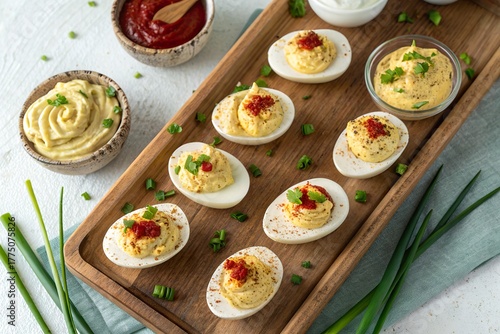 Deviled eggs with paprika and chives arranged on a wooden tray