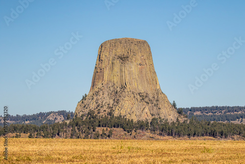 Devil's Tower National Monument, a rare form of igneous rock, rises out of the Wyoming landscape, USA.