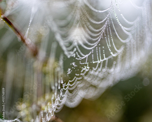 dew drops on spider webs, foggy landscape, early summer morning, morning dew