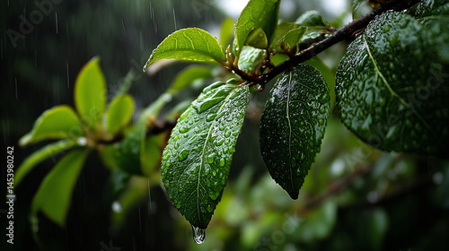 Dew on plants, large drops. Rain falling on fresh green leaves on a branch with visible water drops, beautiful nature concept to use as background or eco theme