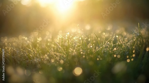 Dew-covered grass illuminated by golden sunrise.