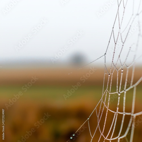 Dew-covered spider web glistens in a foggy field at dawn, nature's beauty