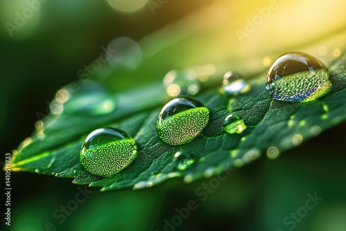 Dewdrops on a vibrant leaf, bathed in sunlight