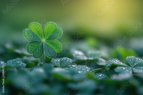 Dew-kissed clover stands out in a vibrant green meadow at sunrise